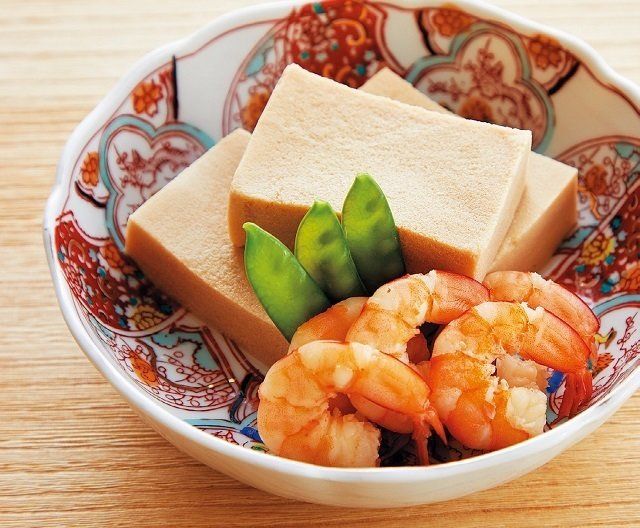 (4)さめたら保存容器などに移し、2のきぬさやを入れて冷蔵室で2時間以上おく。えびは殻をむき、高野豆腐と一緒に器に盛る。(1人分132kcal)