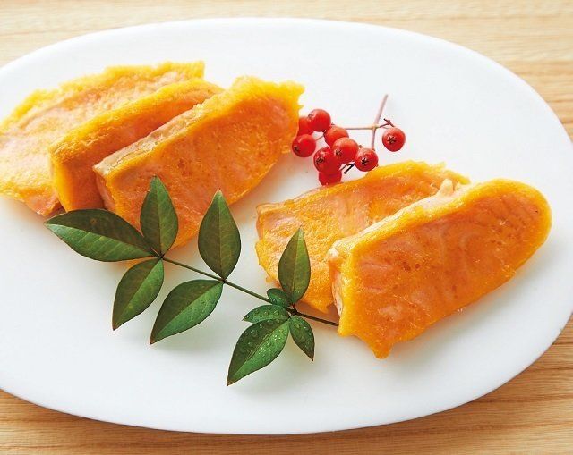 (2)フライパンにサラダ油を弱火で熱する。1 の鮭を黄身ごろもにくぐらせてからフライパンに並べ入れ、弱火でゆっくり火を通す。薄い焼き色がついたら裏返し、同様に焼く。(1人分183kcal)