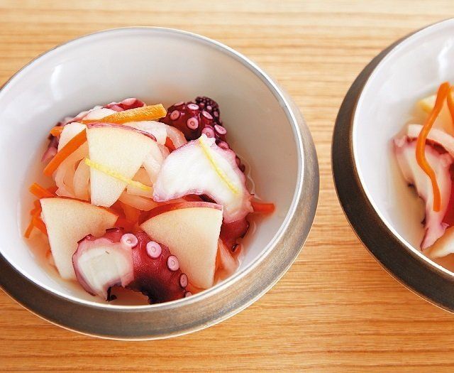 (2)りんごは皮つきのまま薄いいちょう切りに、たこは一口大のそぎ切りにして1 に漬ける。