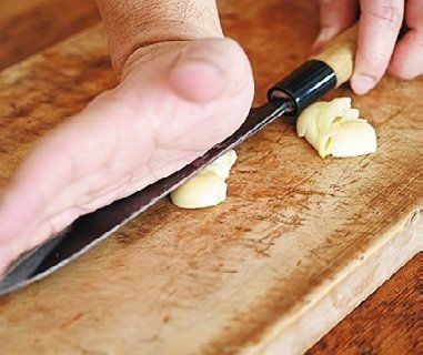 今回包丁を使うのはここだけ!包丁を寝かせて、香りづけのにんにくをつぶして。刻むよりもカンタン。