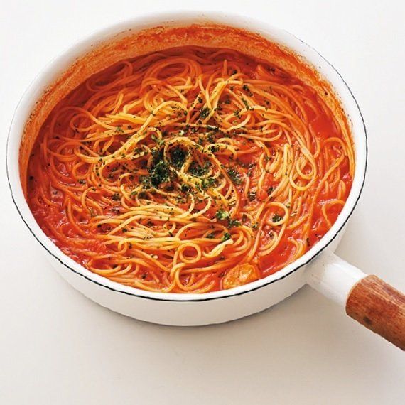鍋にカットトマト缶1缶(400g)を加えて火にかけ、ふつふつしてきたら、袋の表示通りにゆでたスパゲッティ200gを加えてからめる。オリーブ油大さじ1を回しかけ、ドライパセリを振ったら完成!