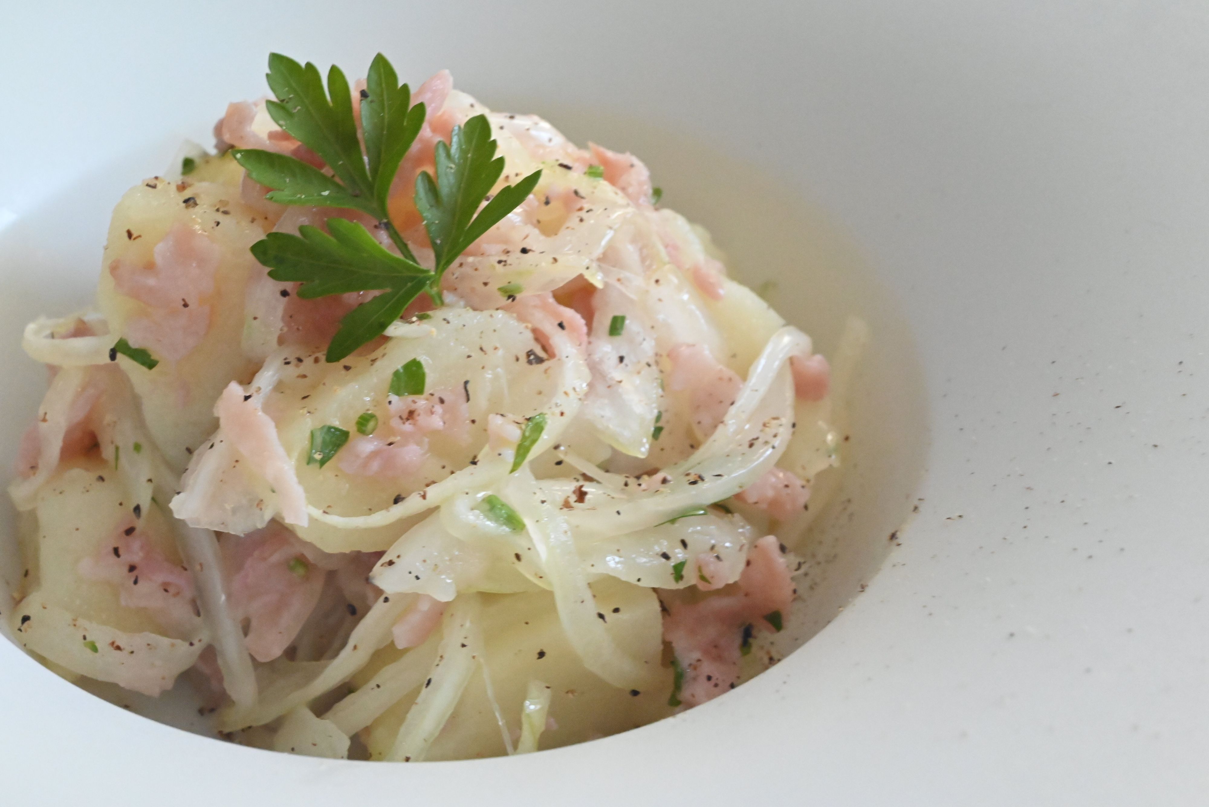 (1)じゃがいもはレンジ加熱し、皮を剥いてひと口大に切る。