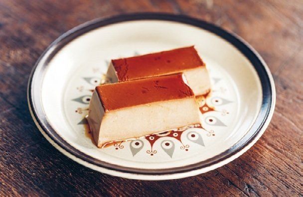 カラメルソースが入ったパウンド型に(3)を流し入れ、冷蔵室で約3時間冷やし固める。固まったら型の周囲にぐるりとナイフなどをそわせて入れ、皿をかぶせてひっくり返し、型からはずす。