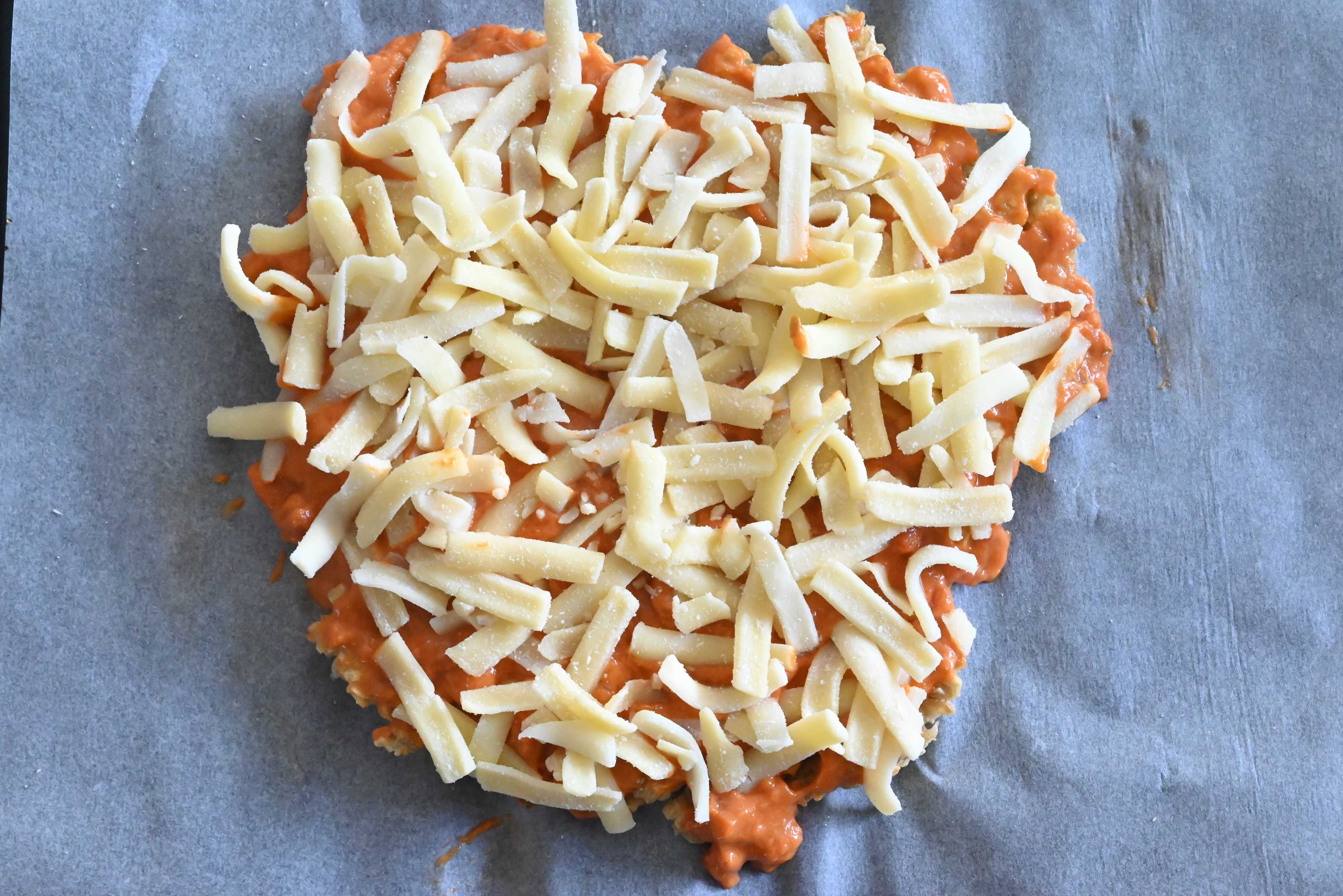 (3)クッキングシートの上に取り出し、トマトソース、ピザ用チーズを広げてのせる。