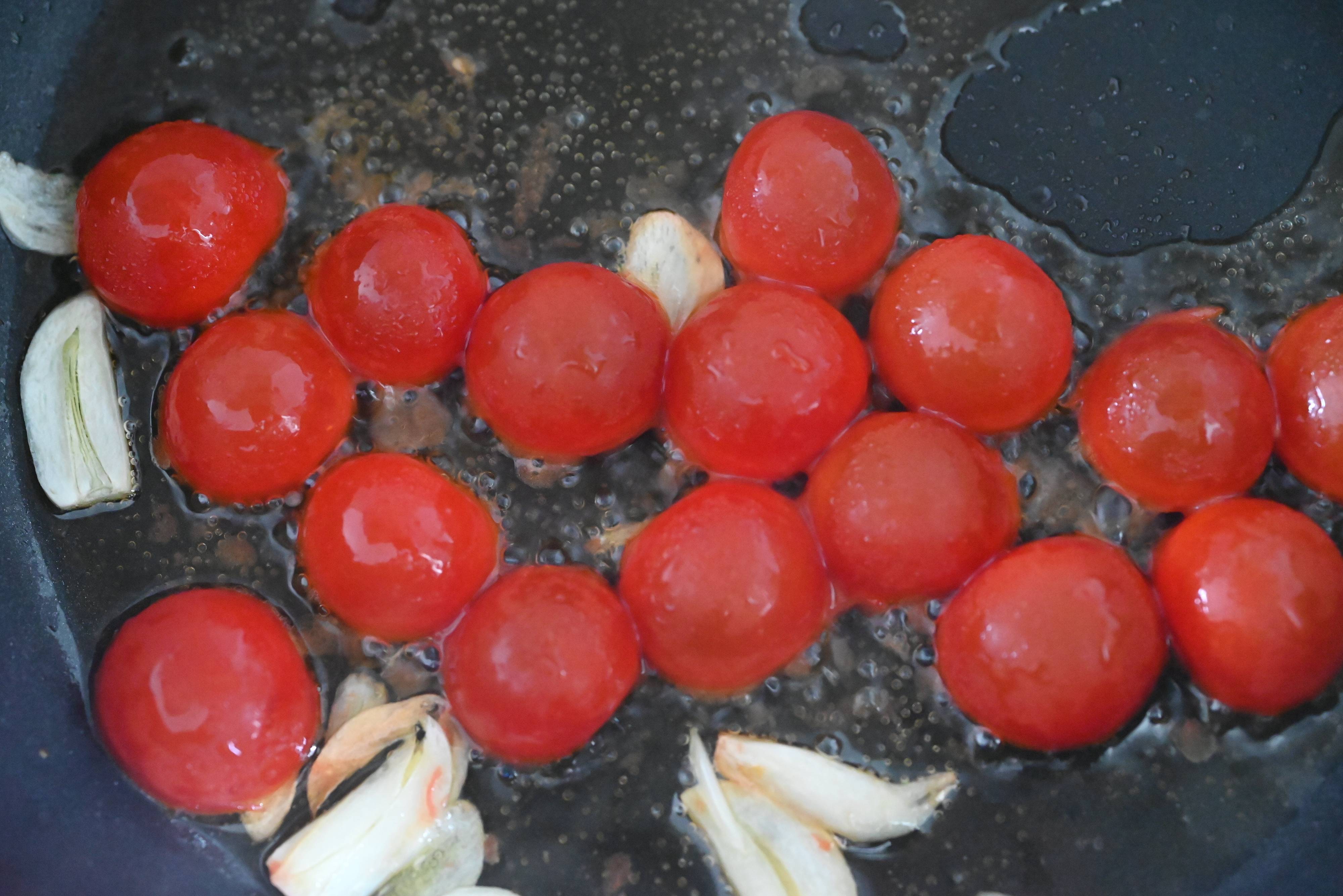 (3)にんにくの香りが出てきたら中火にし、ミニトマトの切り口を下にして加える。