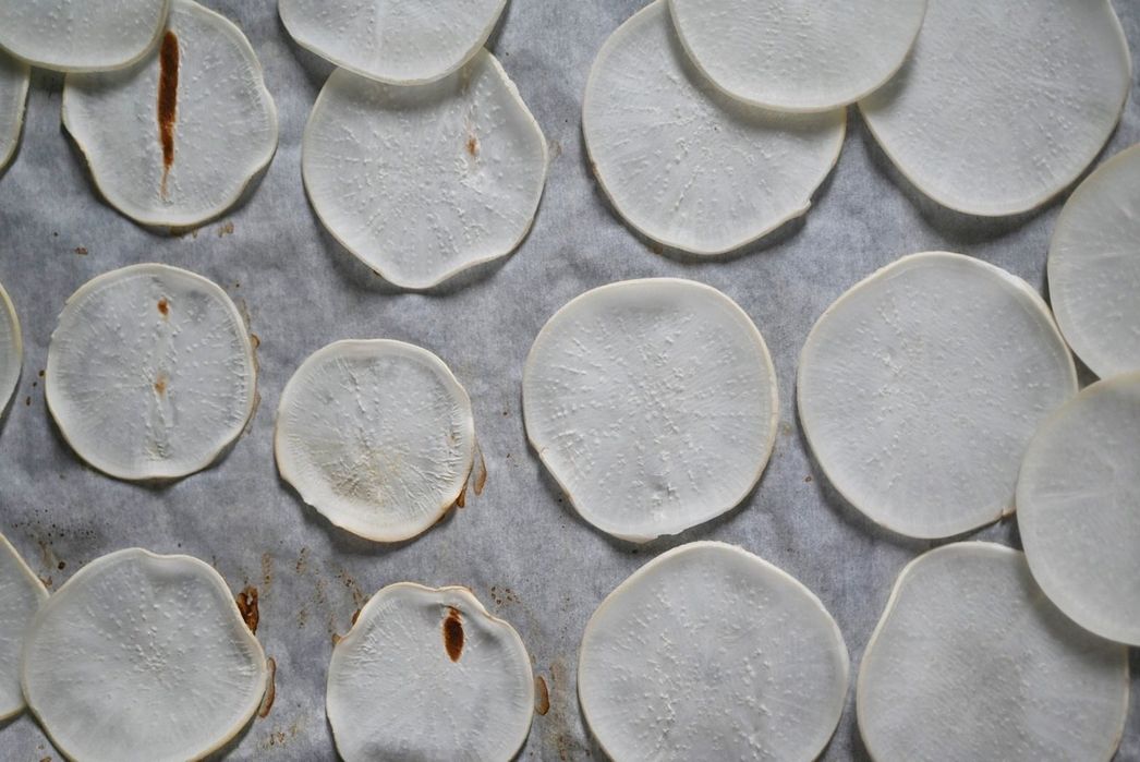 (2)クッキングシートの上にカブを並べ、魚焼きグリル(またはトースター)でうっすら焼き色がつくまで加熱する。