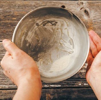 (2)焼き型用のボウルの内側にバター適量(分量外)を薄く塗る。そこに薄力粉適量(分量外)を入れて、全体に粉がつくようにボウルを振り、残った粉を捨てる。