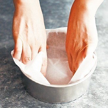 側面になるべくしわが寄らないようにすると、はがしやすい。はみ出した四隅は、外向きに折って型の内側へ入れ込む。