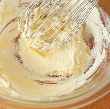 バターに砂糖を加え、泡立て器で全体が白っぽくなるまで、しっかりすり混ぜる。