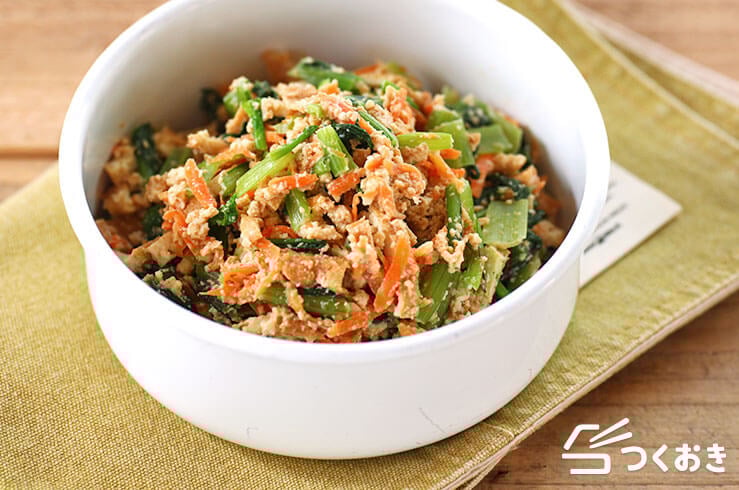 小松菜の白あえに厚揚げを加えると、うま味とコクがアップ!作り置きやお弁当にも便利な、電子レンジだけでつくれる簡単レシピです。ヘルシーなのに、しっかり満足感を味わえますよ。