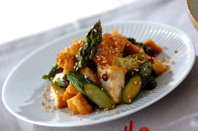 厚揚げとアスパラを使った、食べ応えあるきんぴらのレシピ。具材と調味料を加えて、炒めるだけという簡単さもうれしいですね。作り置きしたり、お弁当に入れたりするのもおすすめです。
