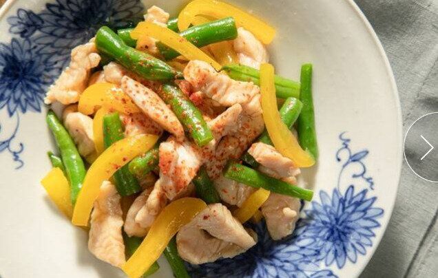 ポン酢で味つけすれば、さっぱりした酸味を味わえる鶏むね肉の副菜が手軽につくれます。サヤインゲンや黄パプリカと一緒に合わせることで、彩りの鮮やかさや食感の変化も楽しめます。