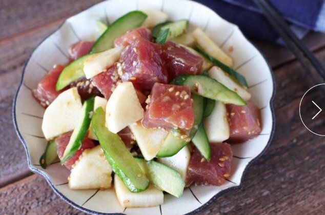 食欲のないときや暑い季節にもぴったりな、切って和えるだけの簡単レシピです。漬けマグロのたれにポン酢を加えることで、さっぱりとした酸味がプラスされ、サラダ感覚でいただくことができます。