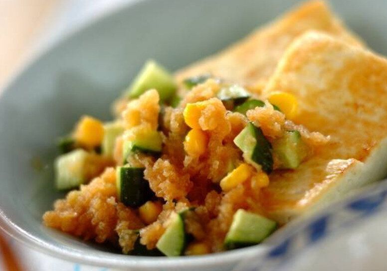 こんがり焼いた木綿豆腐に、コーンやキュウリで食感や風味をプラスしたおろしポン酢だれをかけていただきます。さっぱりとしていてヘルシーなので、小腹がすいたときにサッとつくって食べるのもOK!和食のメインにもおすすめですよ。