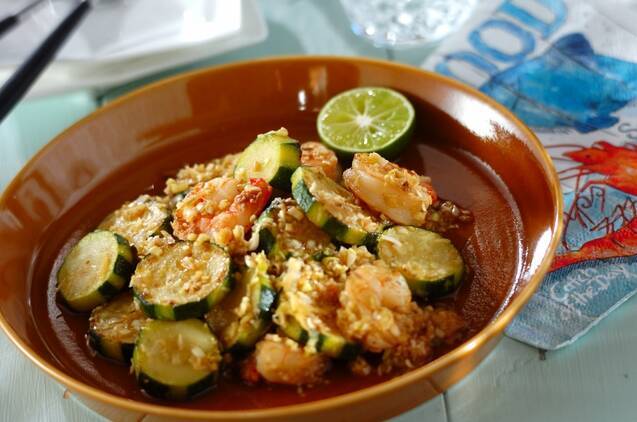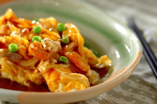 エビを加えた卵に、ポン酢あんをとろりとかけた一品。ふわふわの卵にぷりぷりとしたエビ、シャキシャキの玉ねぎといった食感の違いも楽しめます。あんの照りで輝く緑・黄・赤の鮮やかな彩りに、食欲をそそられますね。