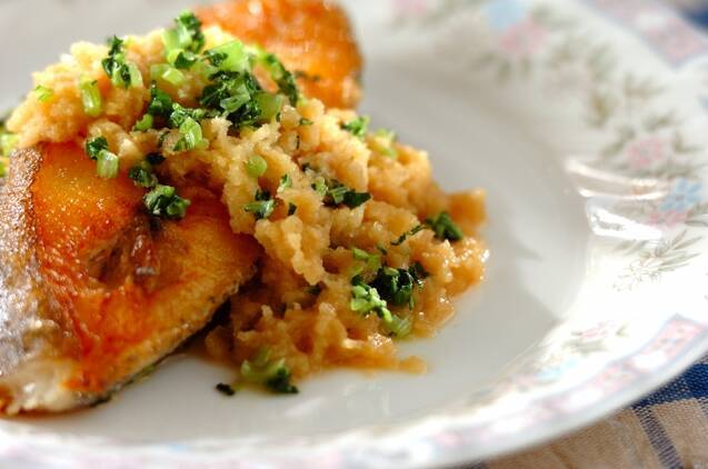 大根おろしたっぷりのポン酢ソースをかけて食べる、カレイのムニエル。ポン酢やカレイの風味と、バターのコクが絶妙にマッチします。仕上げに炒めた大根葉や小松菜を散らして、食感や彩りをプラスしましょう。