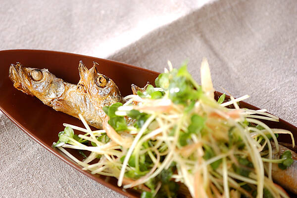 シシャモをマリネ風にアレンジした一品。焼いてそのまま食べるだけのことが多いシシャモですが、ひと手間加えることでちょっとおしゃれな仕上がりに。香味野菜とポン酢のさっぱり感にごま油の香ばしさがマッチしています。