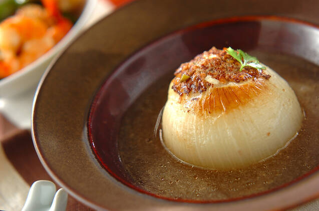 「タネ」にいんげんを加えてつくる、新玉ネギのひき肉詰め煮のレシピです。新玉ねぎの旨み、甘みがスープに溶け出して、お肉のジューシーさと抜群によく合いそう。たまねぎたっぷりで、食べ応えもありそうです。