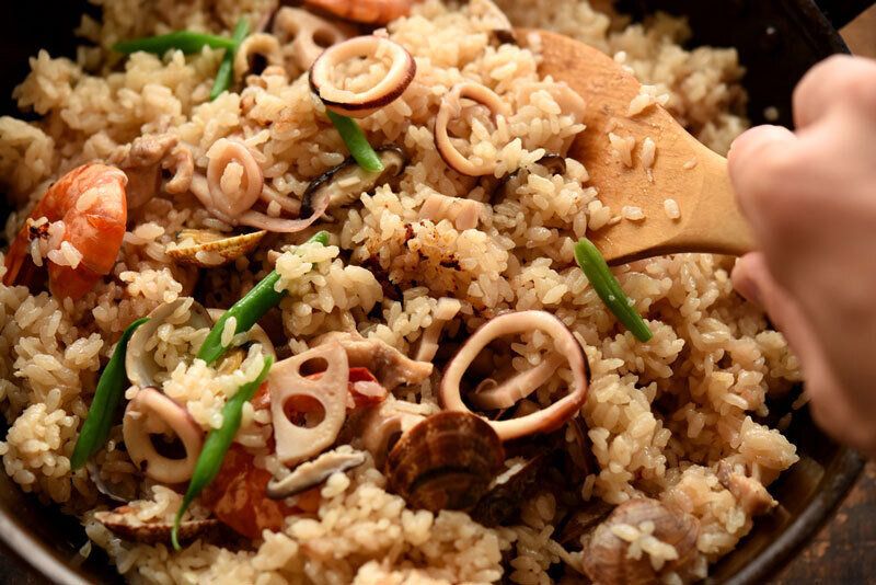 ご家庭でそろえやすい食材を使った和風のパエリアです。おいしくつくるポイントはたっぷりの魚介をいれて、昆布出汁を使うことで馴染みのある食べやすい味になります。