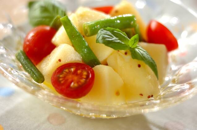 ジャガイモといんげんを蒸した、バジルのサラダレシピです。じゃがいもは温かいうちにキッチンペーパーで包んで皮をむき、カットしたらドレッシングで和えるのがポイントです。