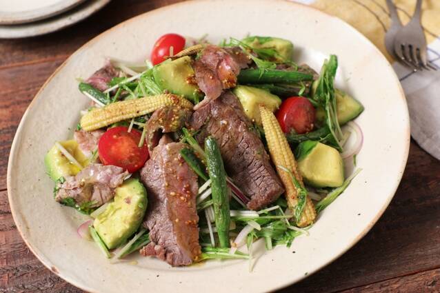ボリューム満点の牛ステーキとアボカドのごちそうサラダレシピです。ステーキにアボカドやたっぷりの野菜を摂取できるので食べ応え抜群。ドレッシングはマスタードを効かせるのがポイントです。