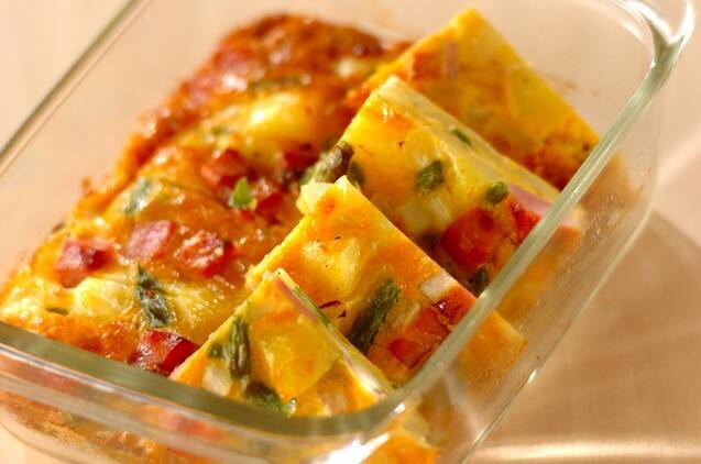 さやいんげんやじゃがいもなど、野菜とベーコンの入った具だくさんオムレツのレシピです。彩りがよくお弁当のおかずとしてもぴったり。前日に具材を炒めておけば、当日は卵液と混ぜて焼くだけと簡単に完成します。