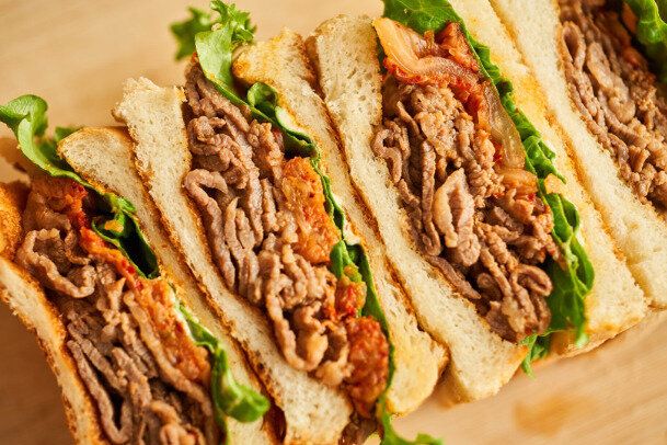 コチュジャンのピリ辛味が食欲をそそる、焼肉サンドのレシピです。焼肉のタレで味つけが簡単に決まるので、少ない調味料でつくれるのがうれしいポイント。ガッツリ食べたいランチにオススメです。