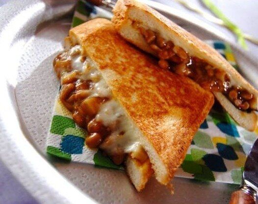 豆板醤のピリ辛と、納豆、チーズ、焼きのりの組み合わせがクセになりそうなホットサンドです。納豆が好きなら、ぜひ一度は試してみたいですね!