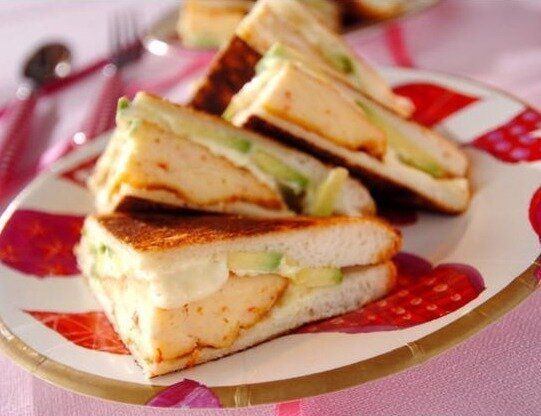 ふんわりとやわらかいエビハンペンとアボカドのホットサンドです。タルタルソースにクリームチーズが入り、とってもリッチな味わい。子どもも喜びそうなホットサンドですね!
