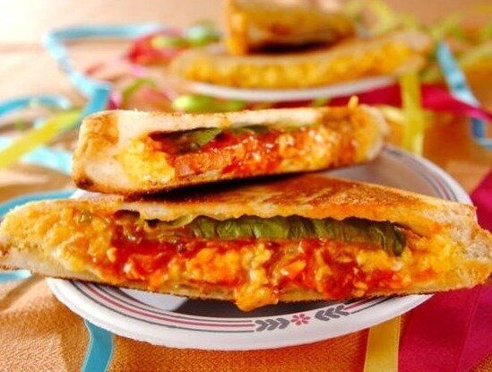 色鮮やかな見た目が食欲をそそるこちらのホットサンドは、ピザソースを使って簡単につくれる一品。シャキシャキの玉ねぎに、とろけたチーズがたまりません!ピリッと辛いタバスコ入りで、ビールやワインのおつまみにもよく合いますよ。ピザ感覚で食べられるのも◎。