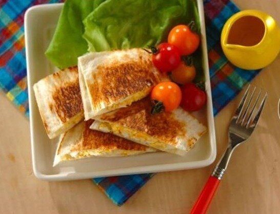 ハムとグリュイエールチーズをはさんだ、ちょっと変わったホットサンド。ゆで卵やレタス、グリュイエールチーズ入りのホワイト―スなどをトルティーヤで巻いてつくります。チーズの風味が感じられるホットサンドです。