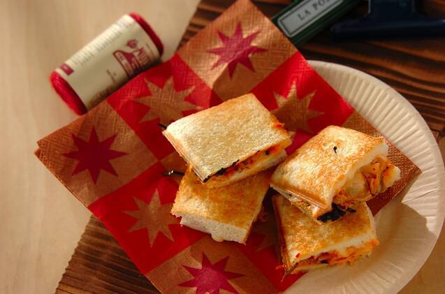 白菜キムチを使った、ちょっぴりエスニックなホットサンドのレシピです。キムチの辛みや酸味に、マイルドなチーズがよく合います。パンにごま油を塗って焼くことで、さらに風味がアップ!