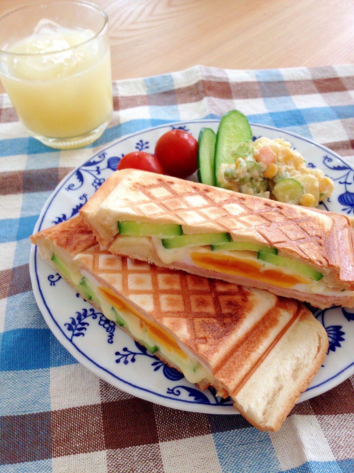 チーズ・ハム・卵という、定番の具材を使ったホットサンド。冷蔵庫にいつでもある食材で、カフェのようなメニューがつくれちゃいます。しっかりとついた焦げ目が、さらに食欲をそそりますね。
