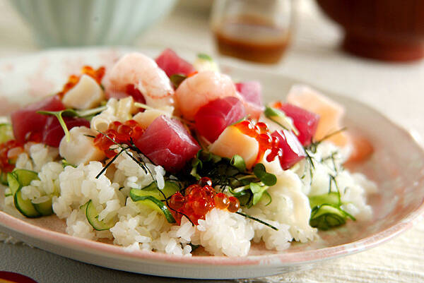 鮮やかなお造りちらしずしのレシピ。お好みで「ワサビ醤油」をかけていただきます。そのままはもちろん、のりで巻いて食べるのもおいしそう。たっぷり作って、友達や家族とテーブルを囲むのもよいですね。