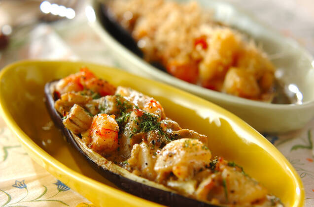 ナスのほか、エビやホタテなどのシーフードも使った、マヨネーズとおみそで2つの味わい☆ナスグラタン。「マヨ醤油」「西京みそダレ」使用で、和食のメインや、お酒のお供におすすめです。