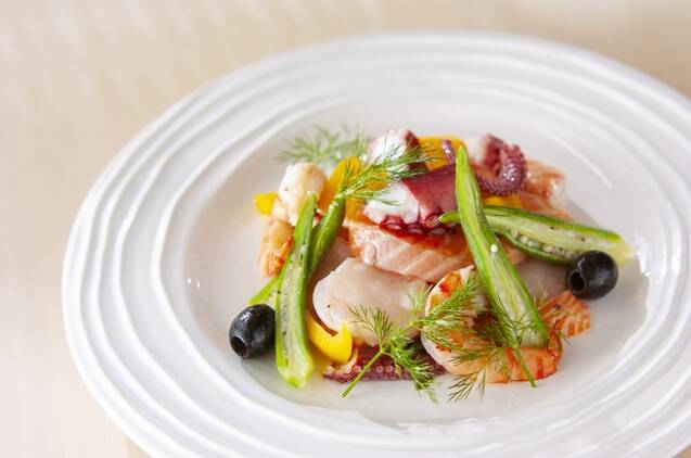 シーフードをたっぷり使って、贅沢気分に浸れそうなマリネのレシピです。「マリネソース」のさわやかさで、魚介をさっぱり味わえそう。季節の旬の食材を使ってアレンジするのもよいですね!