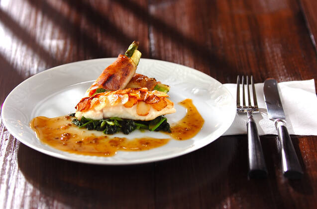 ジャガイモを魚のうろこのように見立てた、ユニークでおしゃれな一品。お皿を彩る「アルベールソース」もポイントです。レシピによれば、魚を焼く時に油を多くしすぎないのがコツです。