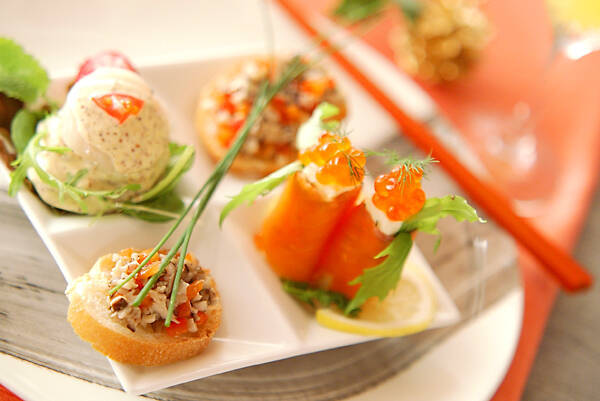 好きなお酒と一緒に楽しみたい、ふたりの前菜3種。「まきまきサーモン」「キノコカナッペ」「ホタテミルフィーユ」を作ります。パーティーを彩る一品や、洋食の副菜メニューにもおすすめです。