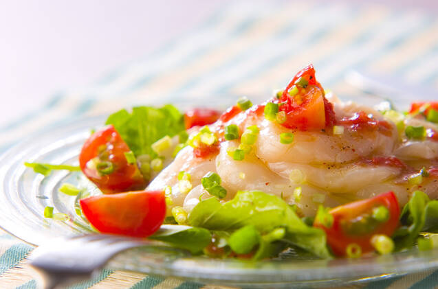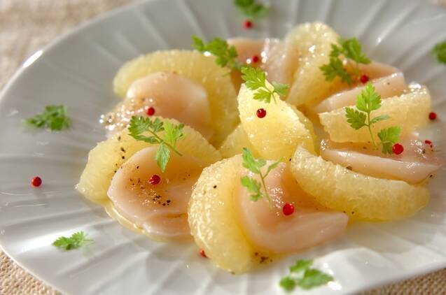 刺身用のホタテを和風のカルパッチョにしたレシピです。軽く湯引きをすることで、甘みがより一層増すのでおすすめ。レモンやすだちなどの柑橘類をプラスするのがポイントです。