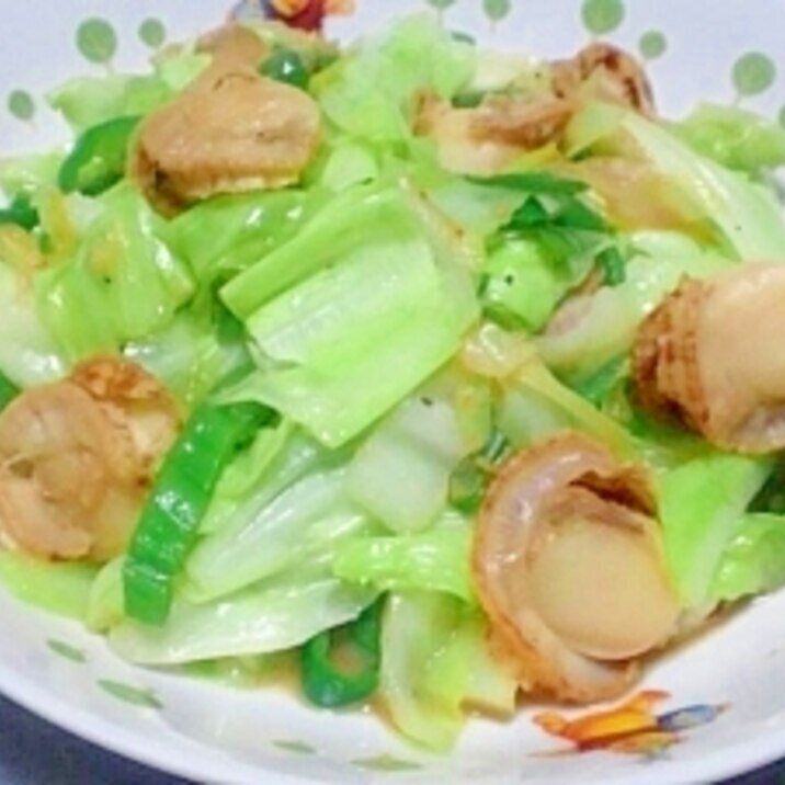 ご飯によく合う、ベビーホタテとキャベツの中華あじ炒め。焼き色をつけたホタテと、シャキッとしたキャベツの食感の違いも楽しめる一皿です。ホタテの甘みが野菜の旨味を引き立てますよ。