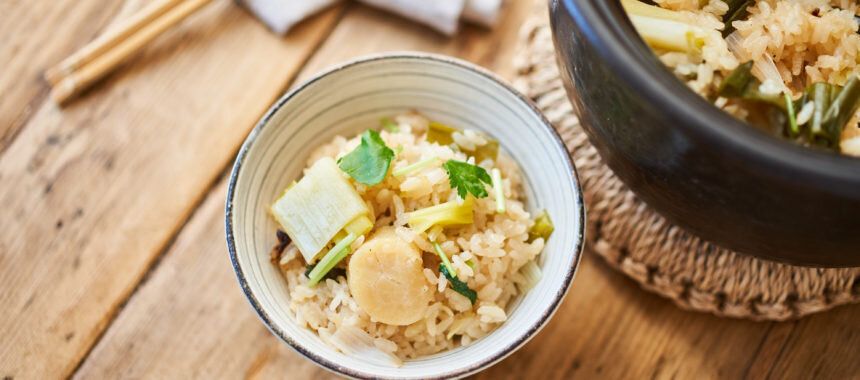 土鍋でつくるホタテとねぎの炊き込みご飯。立派なホタテと、甘くて太いねぎをたっぷり使っています。ホタテやおこげの香ばしい香りが食欲をそそりますよ!もちろん炊飯器でもつくることができます。