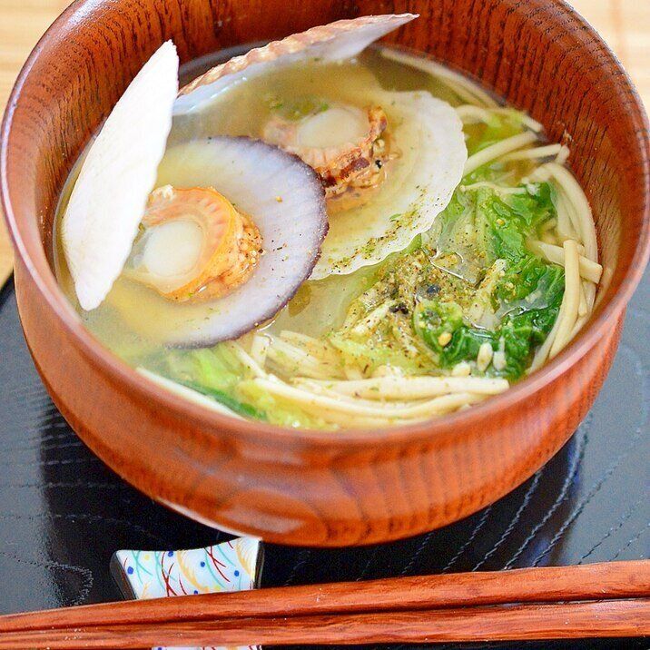 ホタテのだしが旨味をアップさせる、みそ汁のレシピ。貝ごと鍋に入れて、口が開くまでじっくり煮込んでつくります。貝がパカっと開いたら、お椀にきれいに盛りつけて完成です。
