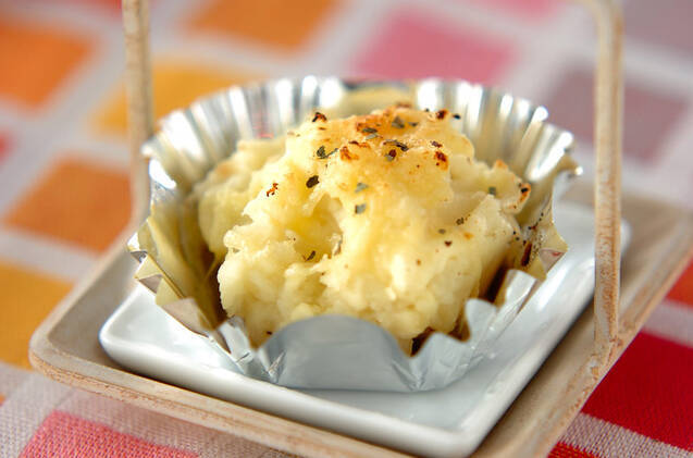 マッシュポテトにホタテ缶をプラスしたこんがりチーズのひとくちジャガ焼きです。一口サイズでつくれるので、お弁当のおかずとしてもぴったり。子どもも喜びそうな一品ですね。
