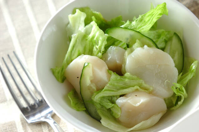 簡単につくれる、ホタテのサラダです。レタスときゅうりをお好みのドレッシングであえるだけシンプルな一品ですが、ホタテがたくさん入っているごちそうサラダにワンランクアップ。