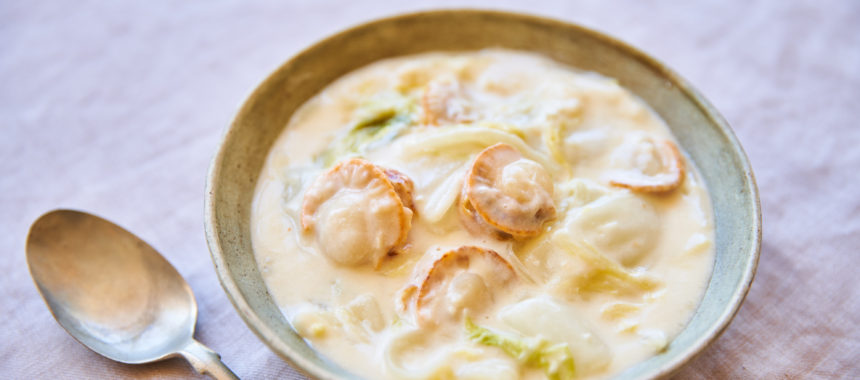 ルーなしでつくる白菜とほたてのクリームシチューのレシピです。蒸発量によって味が変化するので、塩で塩分を調整するのがポイント。とろとろの白菜とホタテの旨味を贅沢に楽しめる一品ですよ。