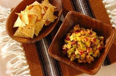ニンニクの風味がおいしいタコとジャガイモのサラダのレシピ。ジャガイモは竹串がスッと刺さるくらいまで電子レンジで温めます。キュウリとマヨネーズで和えて、完成です。