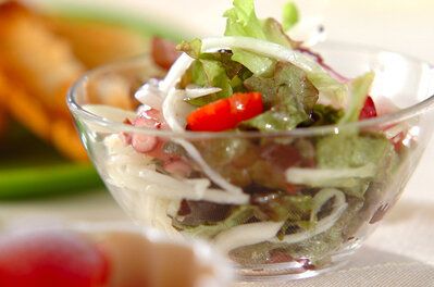タコの食感を存分に楽しめる「タコのサラダ」。タコ以外にはにんじん、大根、大葉を使ってつくります。レモン汁やリンゴ酢、ユズ胡椒などの調味料を混ぜたドレッシングをかけてできあがり。大葉が味のアクセントとなっています。