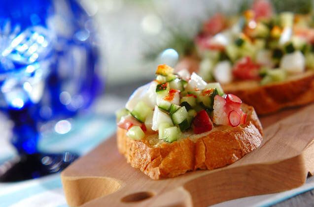 サッパリとした風味を楽しめるきゅうりとタコのブルスケッタです。きゅうりは水分がでないよう、種を取り除くことが大切。調味料をプラスするたびにきちんとあえることで、味がなじみやすくなります。