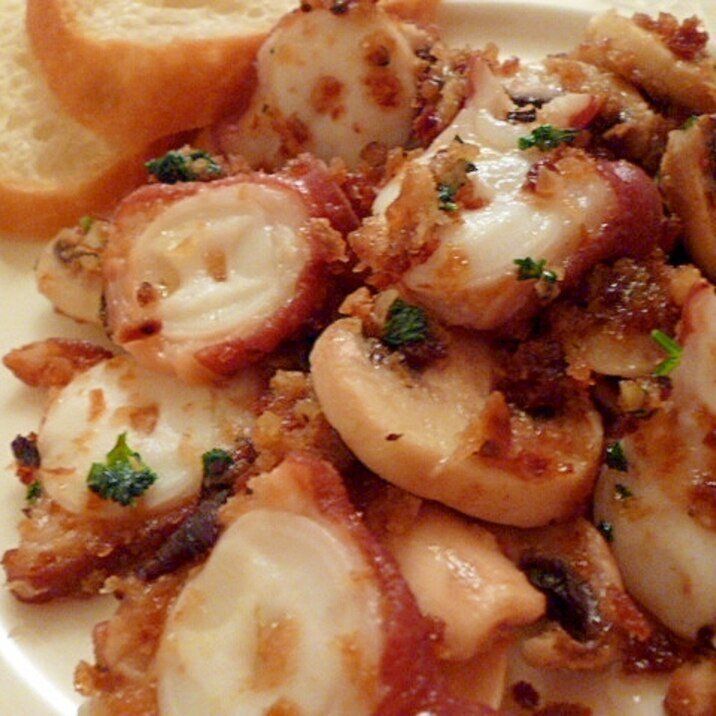 パンといっしょにおつまみとして食べたい、タコとマッシュルームのパン粉炒めです。パン粉のカリカリ食感が楽しい一皿。タコとマッシュルームは火をとおしすぎないのがポイントですよ。