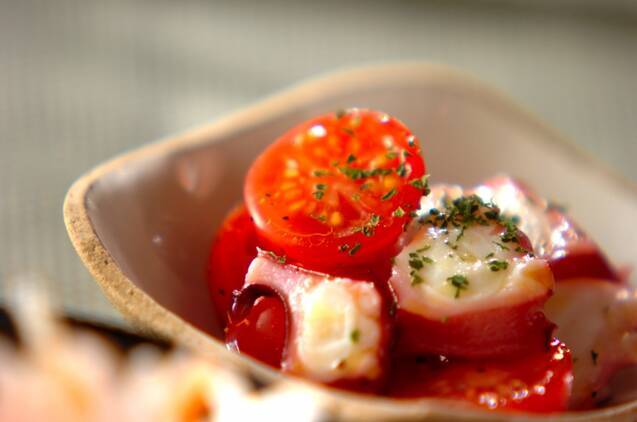 ゆでタコ足とプチトマトの2つの食材だけで作るシンプルなマリネ。マリネ液は塩麹にハチミツを加えたものを使用します。ハチミツの甘さとプチトマトの酸味が絶妙にマッチ。仕上げは彩りにミントを加えると、爽やかさもプラスされるでしょう。